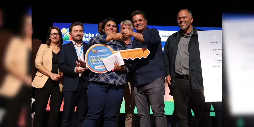 A Prefeitura de Guarapuava, por meio da Secretaria de Habitação e em parceria com o Governo Federal, realizou nesta sexta-feira (23) a solenidade de entrega de 99 casas do Programa Vida Digna II. O evento aconteceu no auditório do Teatro da Universidade Tecnológica Federal do Paraná (UTFPR) e marcou um momento de grande relevância social, representando dignidade, segurança e a concretização do sonho da casa própria para dezenas de famílias guarapuavanas. O projeto teve um investimento de R$ 14,9 milhões.