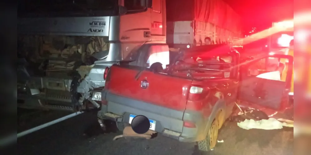 De acordo com o boletim, a colisão teve início com um impacto frontal entre um Fiat Strada, com placas de Piraí do Sul, e um Fiat Toro, com placas de Santo André (SP). Com a força da batida, os veículos atingiram um caminhão Mercedes-Benz Axor, acoplado a um semirreboque, ambos com placas de Sengés.