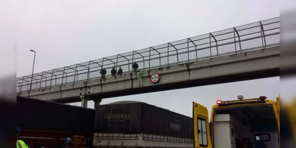 Uma mulher de aproximadamente 45 anos de idade que ameaçava se jogar de uma passarela de pedestres foi resgatada com vida, na manhã desta quinta-feira (14). O fato ocorreu no quilômetro 620 da BR-376, em São José dos Pinhais, região metropolitana de Curitiba. Ao se deparar com a situação, por volta das 8h30, a equipe da Polícia Rodoviária Federal (PRF) parou seis carretas sob a passarela, três em cada uma das duas pistas.