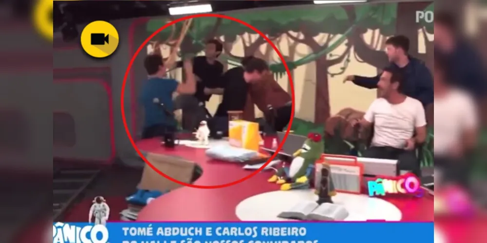 O convidado do programa 'Pânico', Tomé Abduch e o comentarista André Marinho trocaram socos e chutes dentro do estúdio da rádio Jovem Pan