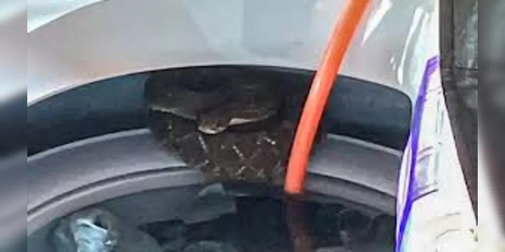Ao mexer em sua máquina de lavar roupas, ela acabou se deparando com uma cobra cascavel escondida no interior do equipamento. Assustada com a situação, a moradora acionou o Corpo de Bombeiros.