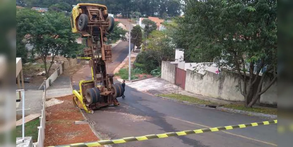 Um acidente impressionante chamou a atenção de moradores da região de Vila Oficinas na manhã desta quinta-feira (4). Um caminhão ‘não venceu’ a subida da rua Carlos Vetorazi, uma das vias que cruza a rua Padre Nóbrega, e o veículo ficou ‘empinado’. O acidente aconteceu por volta das 9h perto do estádio Germano Krüger.