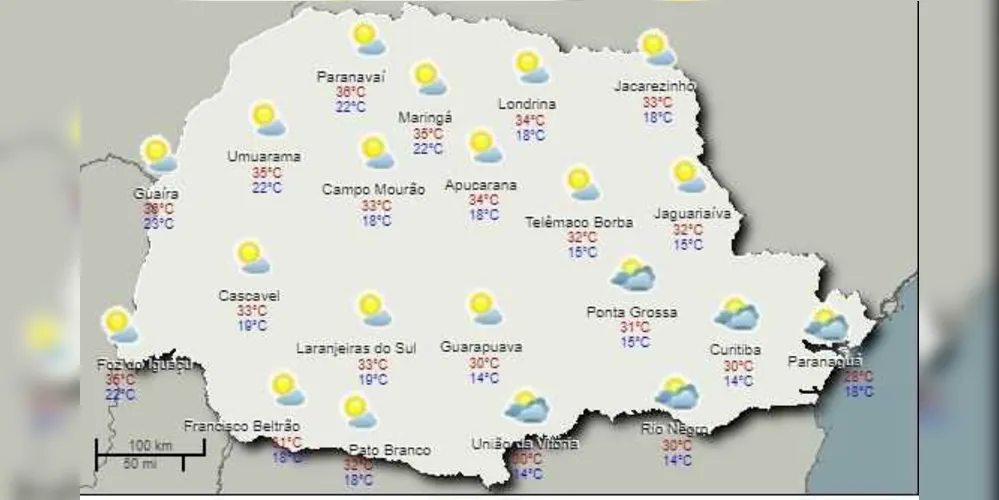 Para os próximos dias, nada muda. Os termômetros continuam subindo e há previsão para pancadas de chuva nas regiões oeste e sudoeste do Paraná. Em Paranavaí, os termômetros devem registar 37°C na sexta-feira. Em Ponta Grossa, as temperaturas ficam na casa dos 31°C na quinta e sexta-feira.