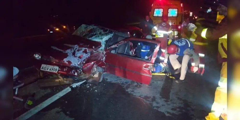 Um carro ficou destruído depois de se envolver em um acidente de trânsito na BR-376, em Ponta Grossa, na madrugada desta segunda-feira (2). A batida envolvendo um carro e um caminhão aconteceu por volta de 4h45 no quilômetro 492 e deixou o motorista de um Gol com lesões graves, mas sem risco de morrer.