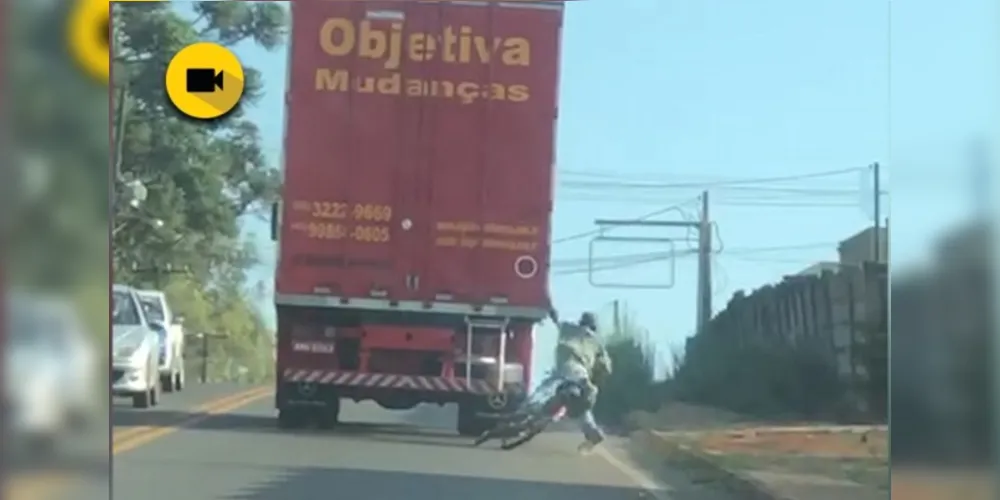 Em PG, ciclista cai após pegar rabeira em caminhão; assista