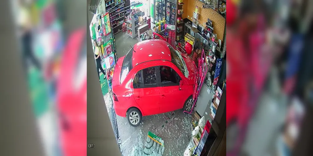 Imagens de câmera de segurança flagraram o momento que um Volkswagen/Voyage invadiu a conveniência do Posto Guapo, localizado no Jardim Carvalho, em Ponta Grossa. O caso aconteceu nesta terça-feira (7).