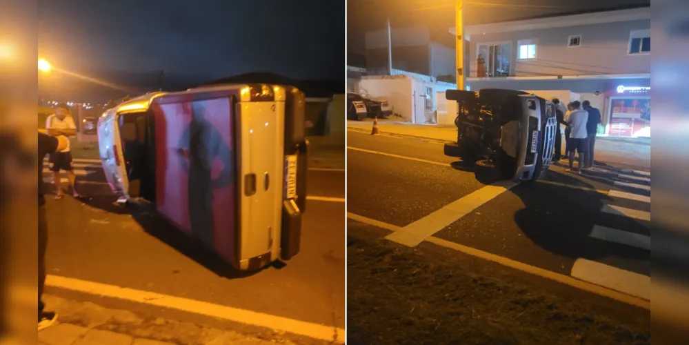 Acidente com capotamento: Colisão entre um carro e uma camionete foi registrada na noite de sábado (21), no cruzamento das ruas Coronel Alcebíades de Miranda e João Carlos Coggo, no Parque Nossa Senhora das Graças, em Ponta Grossa. Após o impacto, a camionete capotou.