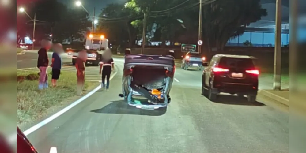 Um carro tombou após colidir contra outro veículo na região do bairro Oficinas, em Ponta Grossa, na noite dessa terça-feira (3). Ninguém se feriu.