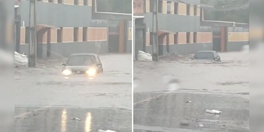 - Um carro ficou preso em um alagamento na rua Afonso Celso, no bairro Uvaranas, em Ponta Grossa, durante a chuva desta quarta-feira (1º).